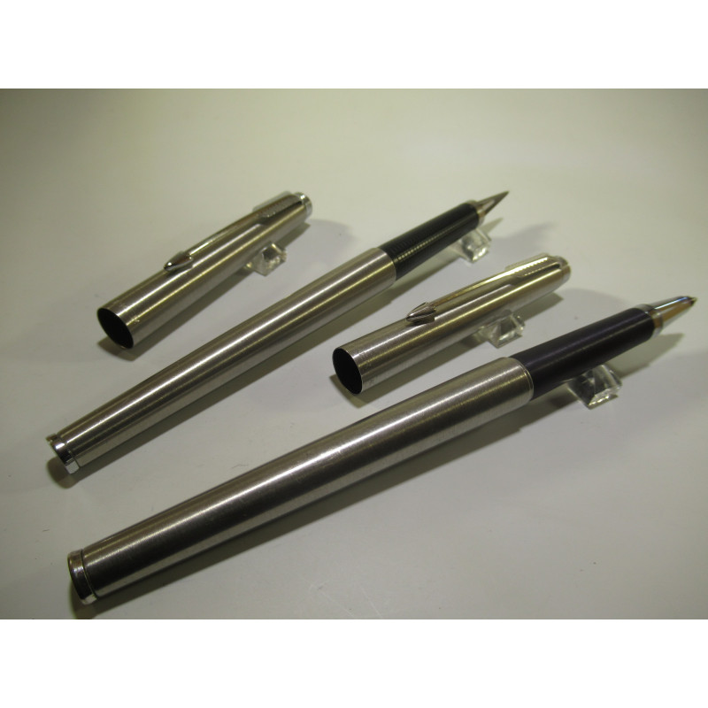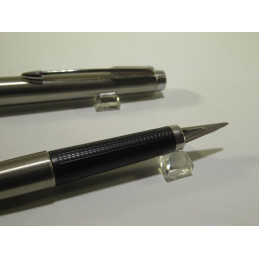 PARKER 180 fountain pen and ballpoint pen set, flat F nib, brushed stainless steel, cartridge filling system, marked on the base of the cap "PARKER - AE - MADE IN FRANCE". The ballpoint pen is functional. Comes with a box of cartridges. Excellent overall condition, for collecting or writing. If you want to use it, ask me to put it into service before shipping it to you.