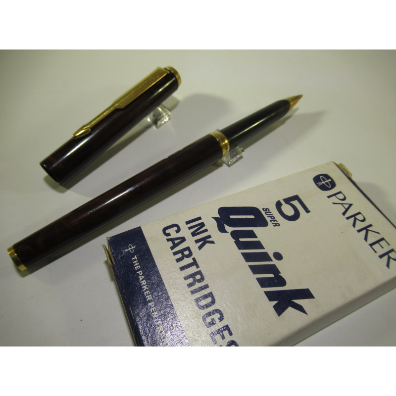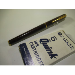 PARKER 95 fountain pen, black and brown lacquer, cartridge filling system (cartridge included), marked "PARKER France" on the base of the cap, gold-plated F nib. Supplied with a box of cartridges. Good overall condition, for collecting or writing.