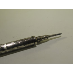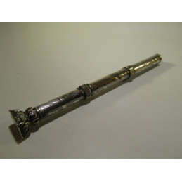 A combination pen holder and mechanical pencil in sterling silver. This set consists of a hollow cylinder containing a pen holder and a mechanical pencil, which can be alternately extended by means of two sliding rings. Each ring allows either the pen holder or the mechanical pencil to be extended. The flared end of this object could be engraved, thus serving to make an impression on a hot wax seal. This one is engraved with a "G". A very fine object from the late 19th century. Length when closed: 100 mm, diameter of the barrel : 6 mm.
