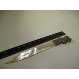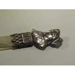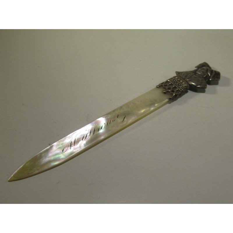 Mother-of-pearl and sterling silver bookmark. The mother-of-pearl section is engraved "Mulhouse" and is set into a sterling silver section embossed with an image of an Alsatian woman in traditional dress. A very beautiful object dating from the late 19th century. Total length: 125 mm.