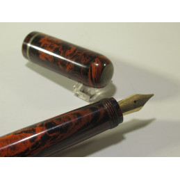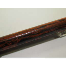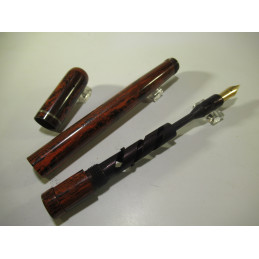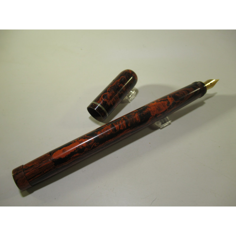 English safety fountain pen LE MERLE BLANC, made in England by the SWAN company. Engraved on the barrel: "LE MERLE BLANC - MADE BY SWAN PEN PEOPLE - FABRIQUE EN ANGLETERRE ", in red and black hard rubber with a white cap top. Functional mechanism, gold nib " WARRANTED – 18 CT – 1st QUALITY ", closed length 126 mm, cap diameter 13 mm. Very good overall condition, for collectors. Not guaranteed for use.