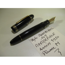 MONTBLANC MASTERPIECE 149 fountain pen in black resin, 1950s. Pump-filling, tested and functional, very good overall condition. Medium nib. Engraved on the cap ring "MONTBLANC – MASTERPIECE". Engraved on the base "149" and "M". For collectors or for writing.