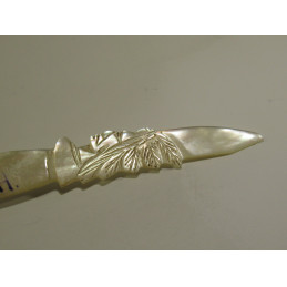 American natural mother-of-pearl pen holder. Carved with an Indian head. Marked "Rye Beach N.H." (New Hampshire). In very good condition. Comes with a small box of some assorted nibs. To learn to write with a pen holder or for collecting. Length: 165mm.