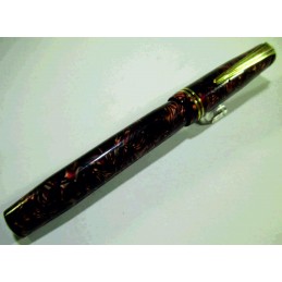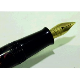 Fountain pen with no visible mark, in pink and black celluloid, closed cap length 112 mm, cap diameter 12.5 mm, gold nib « WARRANTED - 18 CTS - 1st QUALITY », functional push-button filling system, sac inside, cleaned, good general condition, without guarantee to be used, for collection.