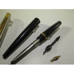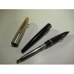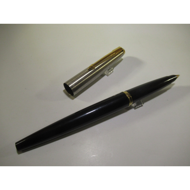 PARKER 45 fountain pen, black, stainless steel cap, 18K gold plated M nib, length with cap: 136 mm, barrel diameter: 11 mm. Supplied with a converter. Very good condition, for collecting or writing.If you want to use it, ask me to put it into service.