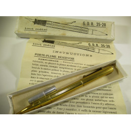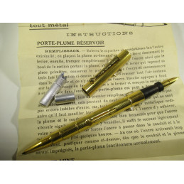 French fountain pen combo, in gilt metal, "14 K PLATED" steel nib, never used, very good general condition, length with cap 136 mm, barrel diameter 9 mm, functional lever filling system, bag in the pen but to change for use. Delivered with its original box, its instructions in French and a full lead case. For collection or for writing.