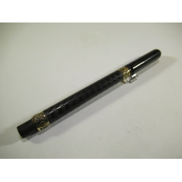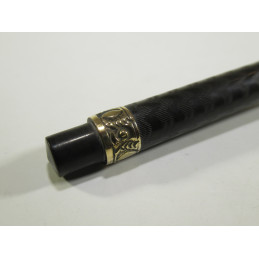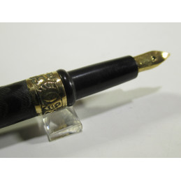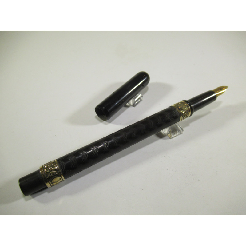 Fountain pen eyedropper without visible mark in black ebonite, length with cap 122 mm, cap diameter 9.5 mm, gold nib "WARRANTED - 18 Cts - 1st QUALITY", two sculpted and gold-plated rings. Very good general condition. For collection. No warranty for use.
