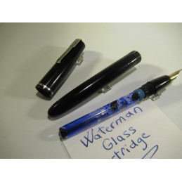 French WATERMAN fountain pen with glass cartridge, new rubber seal, gold nib “WATERMAN’S – 18 Cts – 2 – FRANCE”, black color, marking on the barrel “WATERMAN’S”, length with cap: 132 mm, cap diameter: 14 mm, good general condition. Comes with a filling syringe. Tested and functional, for collection or for writing.