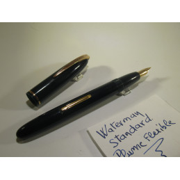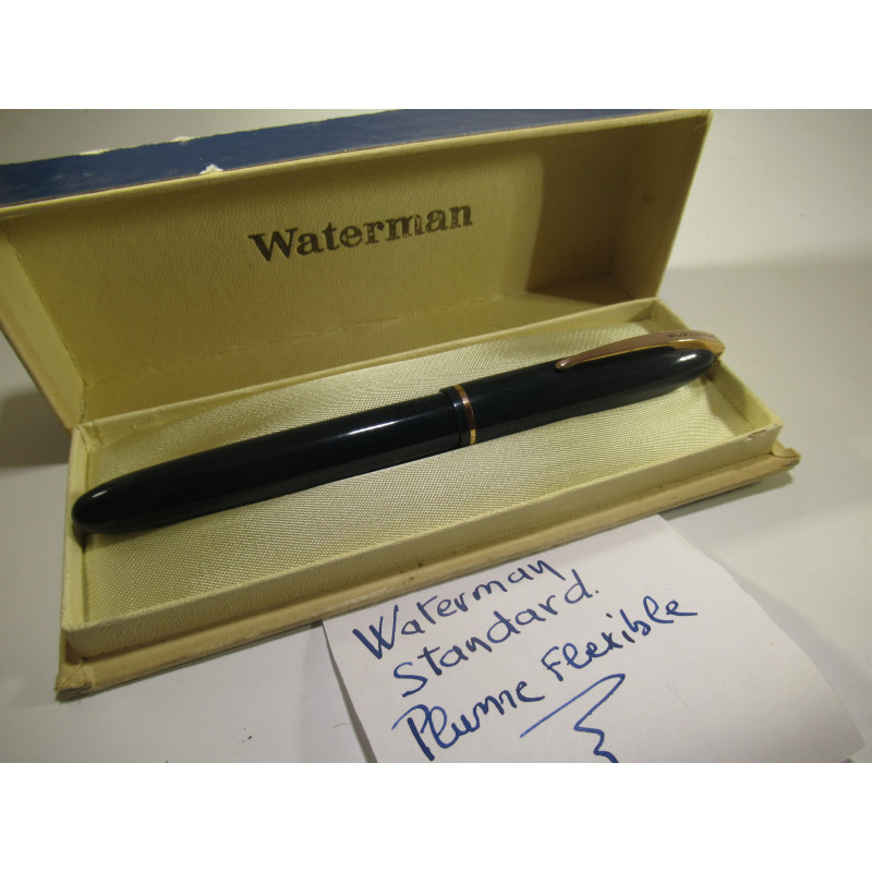 WATERMAN STANDARD fountain pen, lever filling system, with sac in good condition, very flexible gold nib “WATERNAN’S – 18 Cts – 3”, in green resin, marking on the clip “WATERMAN’S”, marking on the barrel “WATERMAN’S – MADE IN France”, very good general condition, length with cap: 135mm, diameter of the cap: 14mm. Delivered in its original case. For collection or for writing.