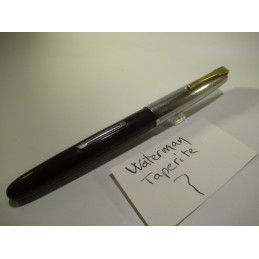 WATERMAN fountain pen, Taperite lever-action model, sac in the pen, 18K gold-capped nib, burgundy color, marked on the clip "WATERMANS", good overall condition, length with cap: 132 mm, cap diameter: 12.5 mm. Tested and functional. For collecting or writing.