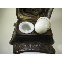 Double inkwell in spelter with white glass inkwells, manufacturer unknown, with Japanese-style decoration of a dragon and flowers. Very good condition.